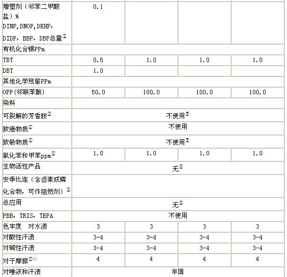 表中將紡織品分成4類,Ⅰ兒童用品,包括嬰兒、兩歲之內(nèi)幼兒的基本產(chǎn)品,紡織品和飾品,不包括皮革服裝。Ⅱ直接接觸皮膚的材料,如短衫、襯衣、床單。Ⅲ不直接接觸皮膚的材料,僅有少部分接觸皮膚(如墊子、防寒襯)。Ⅳ裝飾材料,包括桌布、窗簾、幕帷、幔帳、家具布藝、貼墻布、裝修襯布等。
