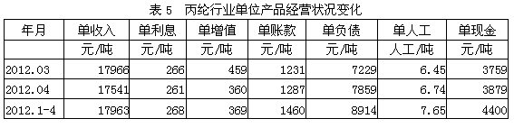 從單位產(chǎn)品經(jīng)營(yíng)狀況變化情況看,2012年1-4月份我國(guó)丙綸行業(yè)中相對(duì)于每噸丙綸產(chǎn)量而言,其單收入(單位產(chǎn)品的主營(yíng)收入)為17963元/噸,單利息(單位產(chǎn)品的利息支出)為268元/噸,單增值(單位產(chǎn)品的增值稅支出)為369元/噸,單賬款(單位產(chǎn)品的應(yīng)收帳款)為1460元/噸,單負(fù)債(單位產(chǎn)品的負(fù)債)為8914元/噸,單人工(單位產(chǎn)品的人工消耗)為7.65人工/噸(表示每人每天生產(chǎn)丙綸產(chǎn)量0.131噸/人工),單現(xiàn)金(單位產(chǎn)品的現(xiàn)金流)為4400元/噸。