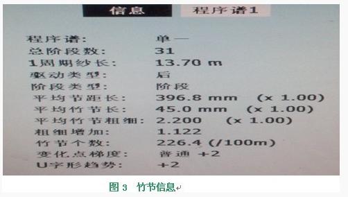 R19.7tex緊密紡竹節(jié)紗:基紗號數(shù)為19.7tex,平均號數(shù)24.0tex,竹節(jié)長度4.5cm,竹節(jié)倍率2.6倍,竹節(jié)間距30~50cm,竹節(jié)循環(huán)個數(shù)31個,采用后羅拉變速控制,100米中竹節(jié)個數(shù)226個。