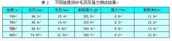 設(shè)定負壓為3.0Kpa,采用四種不同捻度紡紗,成紗毛羽和強力測試結(jié)果見表2