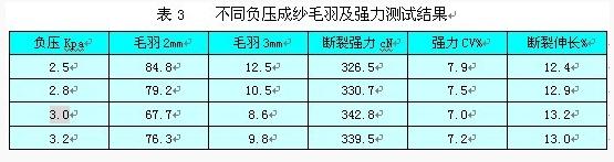 a.對緊密紡異形管負壓大小進行重點測試,對比毛羽和強力,選擇最優(yōu)負壓。