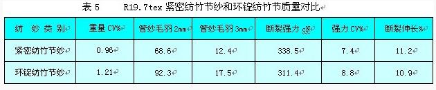 緊密紡竹節(jié)紗產(chǎn)品質(zhì)量明顯優(yōu)于傳統(tǒng)環(huán)錠紡竹節(jié)紗,見表5