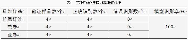 由圖4和表2可知,聚類判別模型對(duì)三種纖維可以進(jìn)行準(zhǔn)確的鑒別。使用系統(tǒng)聚類分析法建模時(shí),樣品的代表性強(qiáng)和種類的齊全程度高直將獲得更高的準(zhǔn)確程度。因此,紅外光譜判別模型仍具有很大的拓展和優(yōu)化空間。