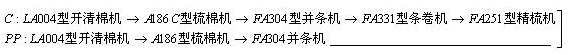 →FA302型X3三道并條→FL-16型粗紗→EJMl28K型細(xì)紗機(jī)→AC238型賜來(lái)福自動(dòng)絡(luò)筒機(jī)。