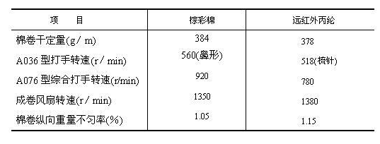 遠(yuǎn)紅外丙綸纖維的回潮率幾乎為零,紡紗過(guò)程中靜電纏繞嚴(yán)重,首先進(jìn)行預(yù)處理,方法為:用熱水配A070型丙綸紡絲油劑,比例為2.5:1,在抓包盤(pán)內(nèi)隔層均勻噴灑,既潤(rùn)滑纖維,又減少了纖維靜電,有效地解決后道工序的"纏、繞、堵、掛"現(xiàn)象。針對(duì)丙綸纖維無(wú)雜質(zhì)、疵點(diǎn)較少的特點(diǎn),采用"多松少打,以梳代打"的工藝原則,僅用一道A036型開(kāi)棉機(jī),各打手速度偏低掌握,各打擊點(diǎn)處隔距偏大掌握,在有效開(kāi)松的基礎(chǔ)上,減輕對(duì)纖維的損傷,減少落棉。開(kāi)清棉工序主要工藝參數(shù)及質(zhì)量指標(biāo)見(jiàn)表1。