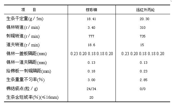 結(jié)合棕彩棉的特性及生條質(zhì)量,在梳理隔距、落棉隔距上稍作優(yōu)化,其余基本上按常規(guī)細(xì)絨棉的工藝參數(shù)上機(jī),其主要工藝參數(shù)為: