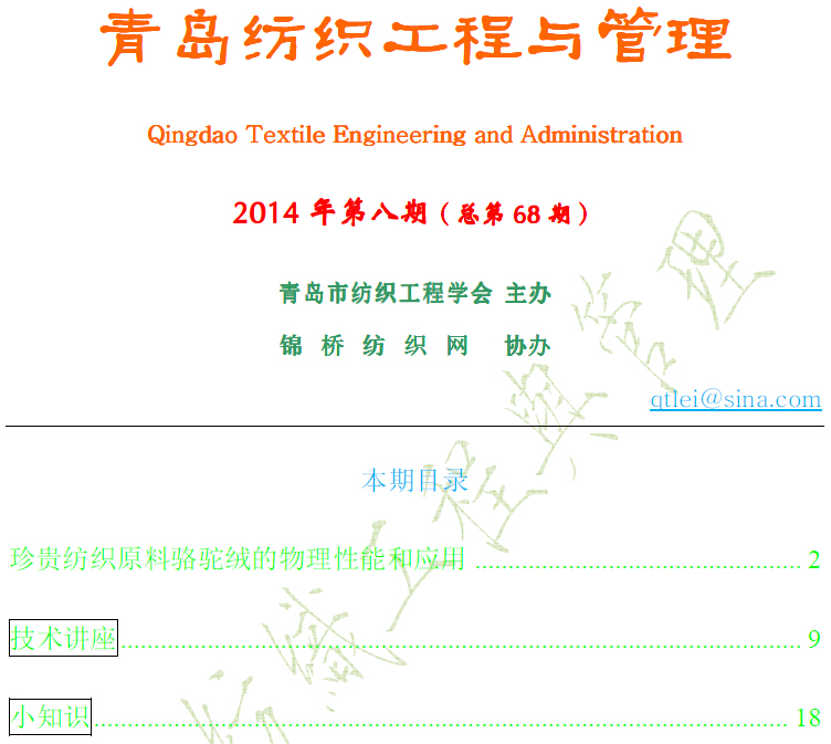 由青島市紡織工程學(xué)會(huì)主辦、錦橋紡織網(wǎng)協(xié)辦的《青島紡織工程與管理》電子期刊于2009年1月正式創(chuàng)刊。該刊由青島市紡織工程學(xué)會(huì)秦志強(qiáng)工程師任主編。該刊除以電子郵件形式發(fā)送至?xí)T單位外,還在錦橋紡織網(wǎng)開(kāi)設(shè)專(zhuān)門(mén)窗口供業(yè)內(nèi)人士進(jìn)行瀏覽與查閱。該刊的創(chuàng)辦定能為廣大紡織業(yè)技術(shù)人員提供1個(gè)技術(shù)交流平臺(tái),為我國(guó)紡織業(yè)技術(shù)創(chuàng)新起到積極作用。