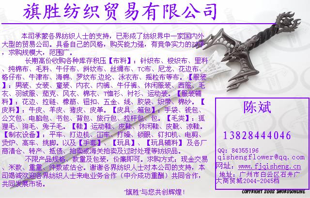 旗勝紡織物資回收公司以是經(jīng)營(yíng)庫(kù)存紡織品為主的貿(mào)易企業(yè)?,F(xiàn)長(zhǎng)期大量回收各廠商清倉(cāng)、轉(zhuǎn)產(chǎn)、抵債、拍賣或海關(guān)拍賣及過(guò)時(shí)處理的庫(kù)存【布料】:針織布、梭織布、里料、純棉布、毛料、牛仔布、斜紋布、絲綢布、TC布、尼龍、花邊布、格仔布、牛津布、海棉、羅紋布.邊綸、泳衣布、搖粒布等布?!痉b】:男裝、女裝、童裝、內(nèi)衣、內(nèi)褲、牛仔衣、牛仔褲、休閑服裝、西裝、西褲、毛衣、羽絨服、茄克、風(fēng)衣、棉衣、T恤衫、襯衫、運(yùn)套裝。【服裝輔料】:花邊、拉鏈、橡筋、鈕扣、五金、制衣線、膠袋、織帶、棉紗?!酒ち稀浚号F?、羊皮、豬皮、皮革?!酒ぞ?、箱包】:手袋、錢包、公文包、電腦包、書包、背包、旅行包、拉桿包、包?!久悺浚汉偯⒐访?、兔子毛?!拘?運(yùn)動(dòng)鞋、皮鞋、布鞋、皮靴、涼鞋。 【制衣設(shè)備】:平車、打邊機(jī)、冚車、打繰、鎖眼、釘扣機(jī)、電剪、燙爐、高車、挑腳。以及【手套】、【玩具】、【玩具輔料】等等。希望與有意清倉(cāng)處理的供應(yīng)商合作<本公司資金雄厚,信義*,以追求量大利薄為宗旨 ,價(jià)位高于一切同行,竭誠(chéng)歡迎您來(lái)電洽談! 隨時(shí)上門收購(gòu)(中介成功傭金重酬)13828444046 13421322525