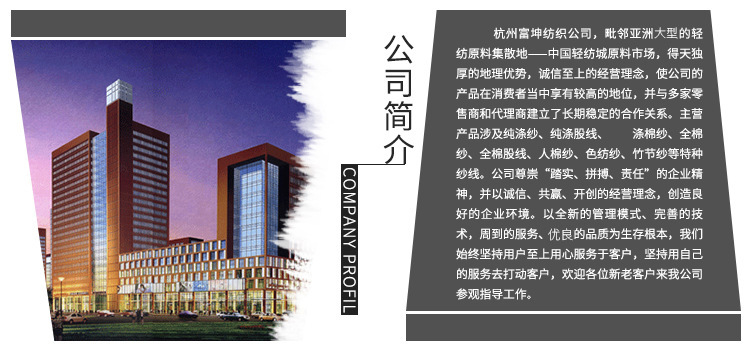 杭州富坤紡織有限公司,毗鄰亞洲大型的輕紡原料集散地-中國(guó)輕紡城原料市場(chǎng),得天獨(dú)厚的地理優(yōu)勢(shì),誠(chéng)信至上的經(jīng)營(yíng)理念,使公司的產(chǎn)品在消費(fèi)者當(dāng)中享有較高的地位,并與多家零售商和代理商建立了長(zhǎng)期穩(wěn)定的合作關(guān)系。主營(yíng)產(chǎn)品涉及純滌紗、純滌股線、滌棉紗、全棉紗、全棉股線、人棉紗、色紡紗、竹節(jié)紗等各種特種紗線。公司尊崇“踏實(shí)、拼搏、責(zé)任”的企業(yè)精神,并以誠(chéng)信、共贏、開(kāi)創(chuàng)的經(jīng)營(yíng)理念,創(chuàng)造良好的企業(yè)環(huán)境。以全新的管理模式、完善的管理技術(shù),周到的服務(wù)、優(yōu)良的品質(zhì)為生存根本,我們始終堅(jiān)持用戶至上用心服務(wù)于客戶,堅(jiān)持用自己的服務(wù)去打動(dòng)客戶,歡迎各位新老客戶來(lái)我公司參觀指導(dǎo)工作。