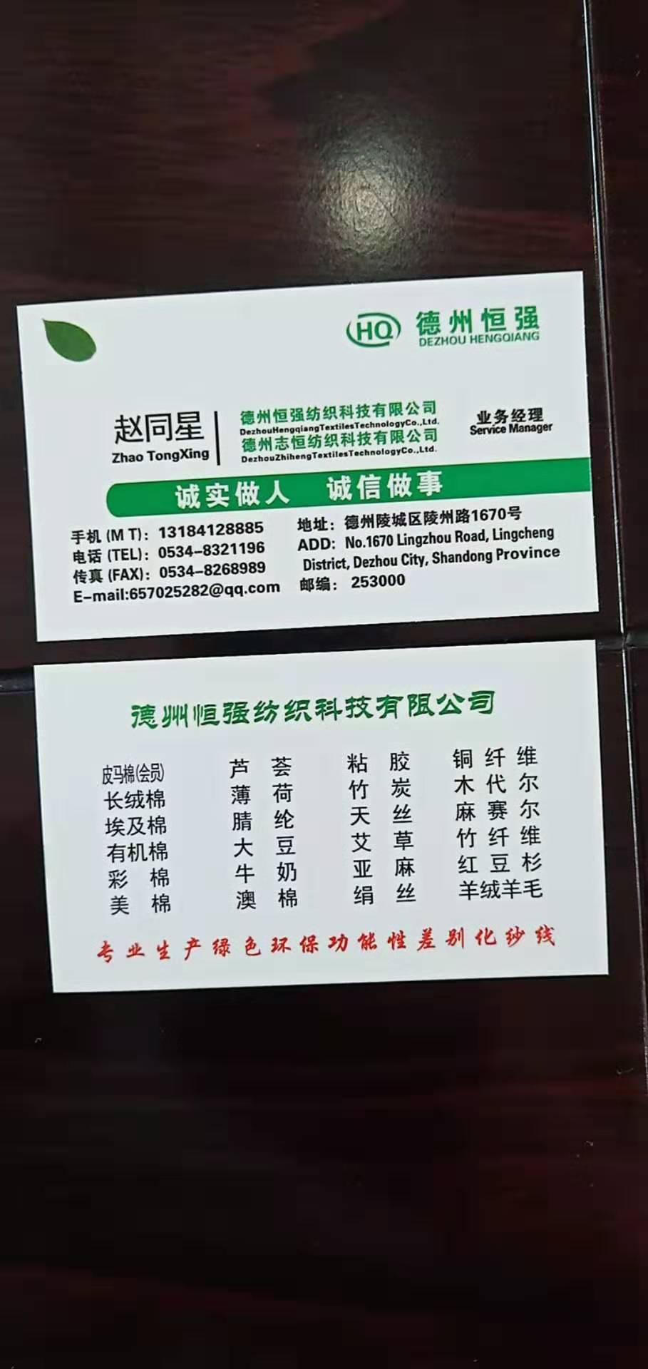 德州恒強(qiáng)/志恒紡織科技有限公司,主營美國皮馬棉(supima),埃及長絨棉,新疆長絨棉,美棉,澳棉,有機(jī)棉,彩棉,新疆細(xì)絨棉,BCI,竹炭,竹纖維,天絲,木代爾,薄荷,蘆薈,草珊瑚,艾草,富硒,竹代爾,奧代爾,紅豆杉,真絲,牛奶,大豆,蠶蛹蛋白粘膠,腈綸等功能性差別化平紗/竹節(jié)紗線,符合當(dāng)下綠色環(huán)保概念,15萬紗錠,廠址德州陵城區(qū)經(jīng)濟(jì)開發(fā)區(qū)陵州路1670號,銷售部辦公樓地址,德州經(jīng)濟(jì)開發(fā)區(qū)綠城百合廣場寫字樓1905室,聯(lián)系人趙同星13184128885