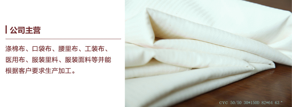 本廠生產(chǎn)的主要品種有:純棉、滌棉、人棉、粘棉、純滌58至128坯布、口袋布、腰里、竹節(jié)坯布、工藝布、服裝布等并且能根據(jù)客戶要求生產(chǎn)加工。