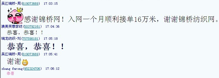 吳江瑞橋紡織周總,感謝錦橋網(wǎng)!入網(wǎng)一個月,順利接單16萬米,謝謝錦橋紡織網(wǎng)! 企業(yè)商鋪:http://m.qdhqly.cn/Website/?Did=13112