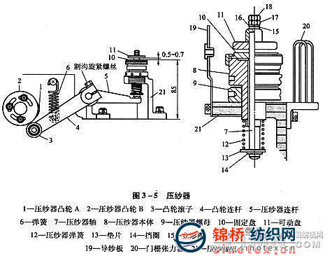 壓紗器的作用是控制緯絲開始進入梭口和結(jié)束飛行而將緯絲夾住,是引緯機構(gòu)必不可少的一部分。分為機械式壓紗和電子式壓紗兩種。電子壓紗由電控程序來控制開閉,用于雙噴嘴和多噴嘴。機械式壓紗主要用于單噴嘴,其結(jié)構(gòu)如圖3—5所示。