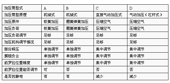 目前國內(nèi)外生產(chǎn)的牽伸加壓搖架共有四種即圈簧機械式加壓搖架、板簧機械式加壓搖架、直接式氣動加壓及集中式氣動加壓。: