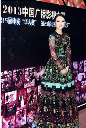 在第十四屆華表獎中,章子怡憑《一代宗師》榮膺“優(yōu)秀女演員獎”。章子怡身著一身復古風蓬蓬裙領獎,黑、紅、藍搭配的裙子充滿了古典意味,絢爛的印花和刺繡非常搶眼,整體上很像一只孔雀。