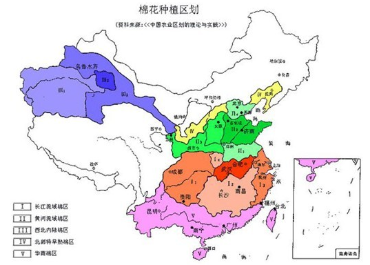 我國是棉花產(chǎn)量居世界首位的生產(chǎn)大國,棉花種植帶大致分布在北緯18度-46度,東經(jīng)76度-124度之間,氣溫>=10度,產(chǎn)棉省市區(qū)22個,棉田面積在40萬公頃以上有7個(新疆,河南,江蘇,湖北,山東,河北,安徽);在10萬公頃以上的有4個(湖南,江西,四川,山西):其他的各省市只有較零星的種植。