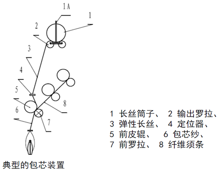 以長絲為芯,短纖維為皮的包纏結(jié)構(gòu)的紗,屬復(fù)合紗??稍诃h(huán)錠紡紗機或捻線機,轉(zhuǎn)杯紡,渦流紡,塵籠紡,自捻紡上實現(xiàn)。