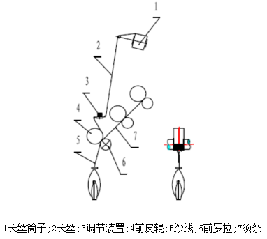 原理:由一根經(jīng)牽伸后的須條與一根不經(jīng)牽伸但具有一定張力的復(fù)絲在加捻三角區(qū)復(fù)合加捻形成的復(fù)合紗。