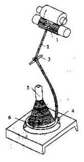 前羅拉1輸出的紗條2經(jīng)導(dǎo)紗鉤3,穿過鋼領(lǐng)6上的鋼絲圈4,繞到緊套于錠子的筒管5上。錠子回轉(zhuǎn)時,借助紗條張力的牽動,使鋼絲圈沿鋼領(lǐng)回轉(zhuǎn),且鋼絲圈帶動紗條沿鋼領(lǐng)回轉(zhuǎn)一圈紗條就獲得一個捻回。同時,因摩擦阻力等作用,鋼絲圈回轉(zhuǎn)總滯后于筒管轉(zhuǎn)速,它與筒管的轉(zhuǎn)速差使紗條卷繞到筒管上。