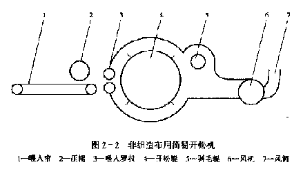 1.混合、開(kāi)松:通過(guò)機(jī)械打擊和撕扯作用,對(duì)不同性能和品種的纖維原料進(jìn)行混合、開(kāi)松。非織造生產(chǎn)以化纖原料居多,天然纖維較少,因此主要進(jìn)行混合與開(kāi)松。