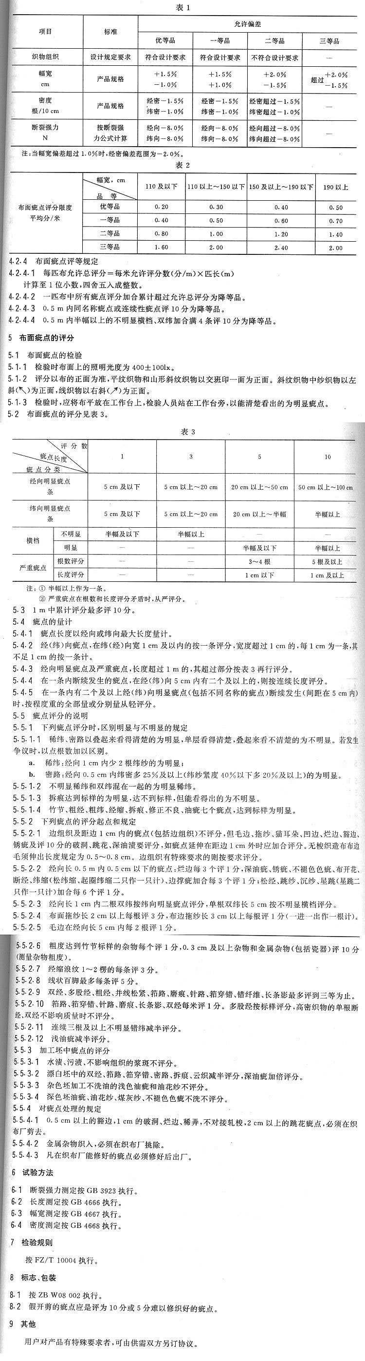 4.1 技術(shù)要求項(xiàng)目有織物組織、幅寬、密度、斷裂強(qiáng)力、布面疵點(diǎn)五項(xiàng)。
