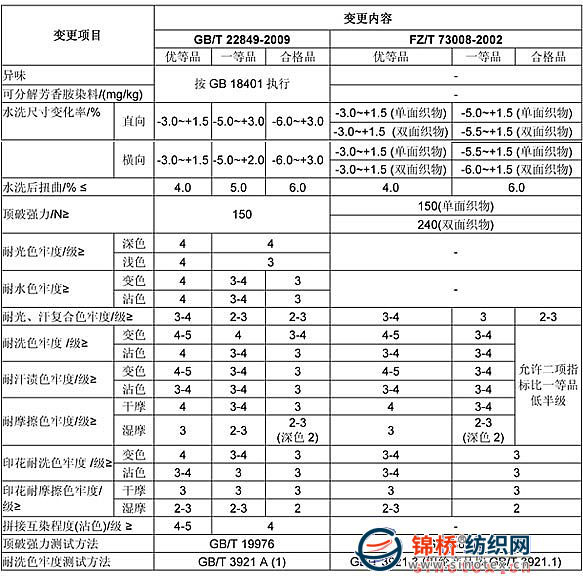 據中華人民共和國國家標準批準發(fā)布公告,FZ/T73007-2002、FZ/T73008-2002分別更新為GB/T22853-2009和FZ/T22849-2009,并將于2009年12月1日正式實施。以下為新舊標準內在質量的詳細對比:
