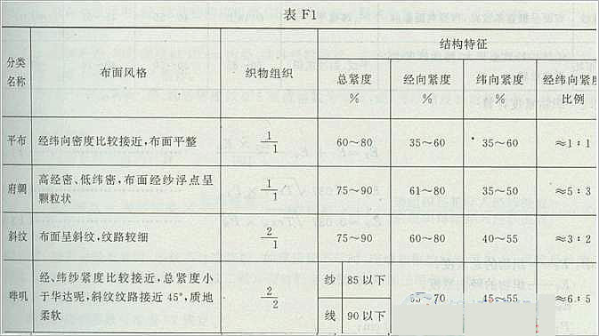F2 棉本色布產(chǎn)品品種的分類,以織物的組織為依據(jù),如組織相同的織物,則以織物總緊度、經(jīng)緯向緊度及其比例進(jìn)行分類。棉本色布一般分為平布、府綢、斜紋、嗶嘰、華達(dá)呢、卡其、直貢、橫貢、麻紗、絨布坯等類別。