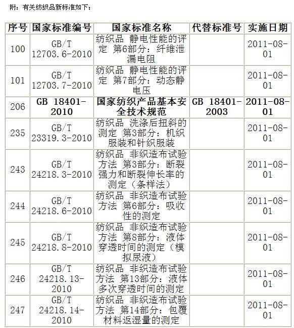 國家標準化管理委員會發(fā)布2011年第2號國家標準公告,其中涉及多項紡織品相關標準,將于2011年8月1日起實施。其中最引人關注的是紡織品強制標準GB18401-2010《國家紡織產品基本安全技術規(guī)范》。此外,《紡織品洗滌后扭斜的測定第3部分:機織服裝和針織服裝紡織品》、《非織造布試驗方法第3部分:斷裂強力和斷裂伸長率的測定(條樣法)》等標準也在8月1日正式實施。新標準相比于老標準,無論是指標要求還測試方法,都有一些新的變化。條款規(guī)定更清楚,可操作性更強。