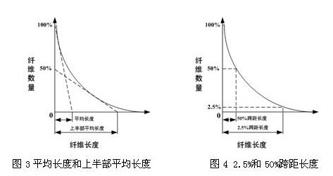 4試驗(yàn)的調(diào)濕 標(biāo)準(zhǔn)中規(guī)定在準(zhǔn)備試樣前,應(yīng)使樣品在紡織品測試用標(biāo)準(zhǔn)大氣環(huán)境下進(jìn)行溫濕度平衡,至少4小時(shí)。目前,HVI在測量棉纖維時(shí),要求樣品至少平衡24小時(shí),如果棉樣濕度超出規(guī)定要求需平衡48小時(shí)。 5標(biāo)準(zhǔn)中的測試方法 棉纖維由梳夾沿其長度方向隨機(jī)夾取,將已經(jīng)取樣的梳夾放于纖維照影儀梳夾固定器上,使棉束朝下,通過固定行程的毛刷刷走疏松的纖維,并使棉束中卷曲的纖維平直,同時(shí)保證纖維在梳針上的分布不受影響,然后放下透鏡組件,操作儀器掃描棉束。該棉束被光電儀器從底部掃描到頂部,期間光通量的變化表征不同長度上棉纖維的根數(shù),從而形成精確的照影曲線圖,通過儀器軟件對照影曲線圖的分析,在儀器顯示屏上可直接得到棉纖維的上半部平均長度和平均長度,如圖3所示。通過照影曲線圖也可得到2.5%跨距長度和50%跨距長度,如圖4所示,目前HVI采用的測試原理與730相同。