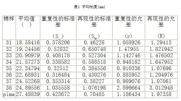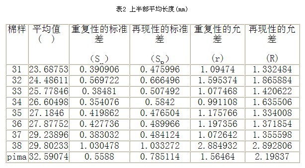 6標(biāo)準(zhǔn)中的精度 在2007年美國利用該標(biāo)準(zhǔn)中的測試方法進(jìn)行了一次實(shí)驗(yàn)室間測試,共十個(gè)實(shí)驗(yàn)室參加,每個(gè)實(shí)驗(yàn)室測試9種待定值的棉花,每種棉花重復(fù)測試5次,每次測試兩個(gè)試驗(yàn)試樣,通過分析測試結(jié)果可得到該方法在實(shí)驗(yàn)室內(nèi)和實(shí)驗(yàn)室間的測試精度,包括數(shù)據(jù)的重復(fù)性和再現(xiàn)性。這次試驗(yàn)的平均長度和上半部平均長度的平均值、標(biāo)準(zhǔn)差和允差如表1、表2所示: