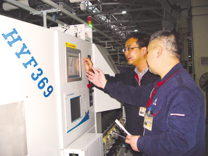 圖為華燕公司質(zhì)保部人員正在按照標(biāo)準(zhǔn)檢測即將出廠的噴氣渦流紡紗機。