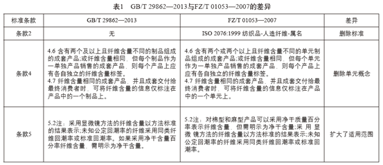 GB/T29862—2013與FZ/T01053—2007兩個標(biāo)準(zhǔn)的具體差異詳見表1。