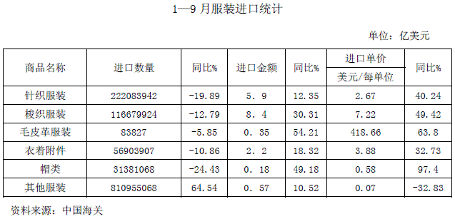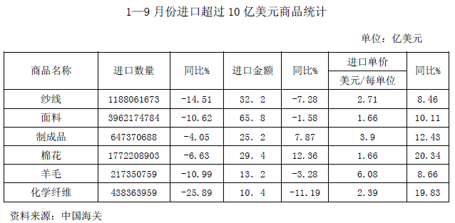 比較典型的進(jìn)口商品是面料,長(zhǎng)期以來(lái)面料一直是我國(guó)紡織產(chǎn)品進(jìn)口的主要商品,無(wú)論是進(jìn)口額還是進(jìn)口量都占到紡織產(chǎn)品進(jìn)口總額和總量的30%以上,多年來(lái)一直保持比較平穩(wěn)的上升趨勢(shì)。今年1—9月份,在面料進(jìn)口單價(jià)上漲10.1%的情況下,進(jìn)口額同比下降了1.58%。更值得關(guān)注的是,出現(xiàn)了棉紗線和化纖紗線進(jìn)口額同步下降的情況,這是近幾年來(lái)從未有過(guò)的情況。其他進(jìn)口規(guī)模較大的商品,進(jìn)口數(shù)量都有不同程度的下降。進(jìn)口量同比下降最大的是化纖,達(dá)到25.89%,進(jìn)口額下降了11.19%