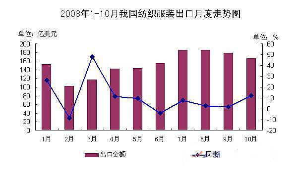 據(jù)海關(guān)統(tǒng)計,今年1-10月我國出口紡織服裝(包括紡織紗線、織物及制品和服裝及衣著附件,下同)1536.8億美元,比去年同期(下同)增長8.6%,增幅較去年同期回落11.5個百分點。其中, 10月份當(dāng)月我國出口紡織服裝167.5億美元,同比增長12.5%(下圖)。