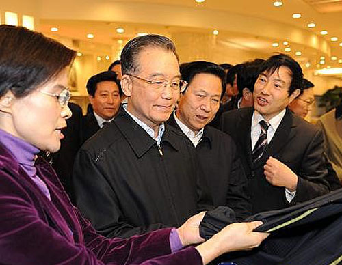 1月9日溫家寶在陽光股份有限公司查看布料質量,鼓勵企業(yè)開拓市場,走向世界。 只要勇于創(chuàng)新和開拓市場,就能經受住風浪的考驗 1月9日下午,溫家寶剛下飛機就來到長江岸邊的江陰市調查研究。 陽光股份有限公司是1家生產毛紡和高檔服裝的企業(yè),在展廳里溫家寶認真察看企業(yè)各類產品。企業(yè)負責人告訴總理,盡管受金融危機影響出口產品價格有所下降,但是企業(yè)靠不斷推出新產品,訂單沒有減少,在國際知名品牌企業(yè)訂貨中他們享有優(yōu)先權。溫家寶聽后十分高興,勉勵他們在國際市場闖出更大的天地。車間里一派忙碌的景象,工人們告訴總理,臨近春節(jié)但是出口產品生產排得滿滿的,大家心里都很踏實。溫家寶告訴大家,國家扶持政策為企業(yè)發(fā)展提供良好的外部條件,但是企業(yè)只有勇于創(chuàng)新和開拓市場,才能經受住風浪考驗,你們不僅要克服眼前的困難,更要使經營水平、產品質量、競爭能力上1個大臺階,做到人無我有、人有我優(yōu),讓自主的陽光品牌走向世界! |