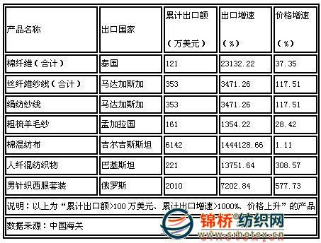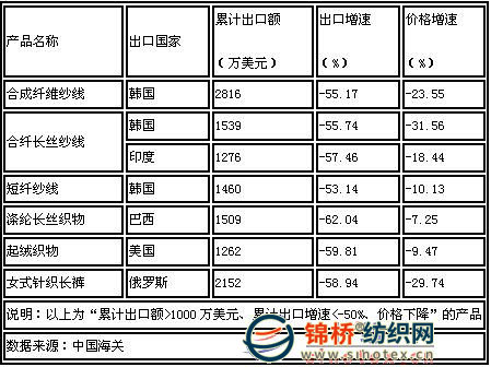 抓住機(jī)遇避風(fēng)險 在整體出口不振的情況下,以輸往韓國合成纖維紗線為代表的一批產(chǎn)品,市場萎縮尤其嚴(yán)重。出口增速為-50%以下,價格下跌,對于超千萬市場而言,無疑是巨大下滑。 當(dāng)然,并非所有的產(chǎn)品、市場都令人沮喪。圖3中1~2月出口額超100萬美元、出口較上年增長10倍以上、價格還有所上升的產(chǎn)品也是各行業(yè)都有所涉及。盡管旺銷的市場主要集中在發(fā)展中國家,但同時也意味著紡織產(chǎn)品具有更大的增長空間。 圖2 暴跌的市場