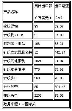 在各主要市場中,出口日本的紡服盡管增長僅為0.91%,但作為惟一一個增長的主要市場仍顯得頗為引人注目。尤其是服裝的輸出,25.08億美元的出口總額、2.65%的增速,已經(jīng)算是很好的表現(xiàn)。具體產(chǎn)品方面,針織服裝如女式西服套裝、領(lǐng)帶等出口相當(dāng)不錯,出口增速分別為442.24%、604.45%,也算是亮點中的亮點。 其他超10億美元的市場,東盟(10.76億美元,-20.93%)、歐盟(52.52億美元,-14.94%)、美國(34.31億美元,-8.05%)等出現(xiàn)不同程度的下滑。 以美國為例,受金融危機(jī)的影響,居民收入下滑,2月份個人收入月率下降0.2%,人們紛紛增加資金儲存以抵御經(jīng)濟(jì)衰退的沖擊,2月份個人消費支出增速放緩,為0.2%,1月份經(jīng)修正后為1.0%,而儲蓄率(4.2%)卻升至歷史高位。在實體經(jīng)濟(jì)未出現(xiàn)好轉(zhuǎn)前,進(jìn)口需求減少。根據(jù)美國商務(wù)部公布的數(shù)據(jù)顯示,經(jīng)過季節(jié)性因素調(diào)整之后,美國2月份商品及服務(wù)進(jìn)口額降至1527億美元,為四年多以來最低水平。其中,來自中國的進(jìn)口額降至三年新低??傮w看,國際市場的提振還需時日。 圖4 對日本出口增速超50%的產(chǎn)品