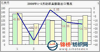 【錦橋專稿】海關(guān)統(tǒng)計(jì)資料顯示,2009年5月,我國(guó)紡織品服裝出口123.06億美元,同比下降14.7%,環(huán)比4月下降1.5%。其中紡織品出口48.95億美元,分別下降16.3%和4.4%;服裝出口74.11億美元,同比下降13.7%,環(huán)比微升0.5%。