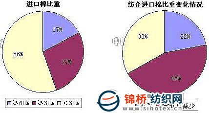 3.棉紡織企業(yè)進(jìn)口棉占總用棉比重:新棉雖然上市,但是質(zhì)量不盡人意,新疆棉和進(jìn)口棉依然是許多被調(diào)查大中型企業(yè)的首選。調(diào)查結(jié)果顯示,被調(diào)查企業(yè)中,33%減少進(jìn)口棉用量,45%增加進(jìn)口棉用量。紡企進(jìn)口棉比重31.38%,較上月增加2.86個(gè)百分點(diǎn)。
