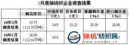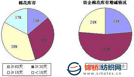 1.棉紡企業(yè)棉花庫存情況:鑒于目前現(xiàn)貨市場棉價強勢,多數(shù)企業(yè)購棉保持理性,1個月左右?guī)齑嫠奖容^普遍,少數(shù)企業(yè)年前大量采購棉花,目前企業(yè)庫存充裕。由于市場需求原因,目前棉織物需求增加,企業(yè)棉花用量在所有原料中所占比重有所提高。被調查企業(yè)中,24%減少棉花庫存,52%增加棉花庫存;平均棉花庫存35.77天,折合棉花工業(yè)庫存量112.78萬噸。