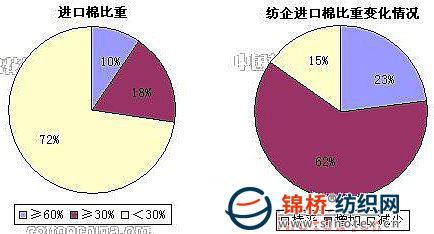 3、棉紡織企業(yè)進(jìn)口棉占總用棉比重:新下發(fā)的配額已經(jīng)到用棉企業(yè)手中,不少企業(yè)之前已經(jīng)訂好了外棉,正在陸續(xù)到廠。此外,還有部分企業(yè)直接去保稅區(qū)買棉花,雖然據(jù)了解,目前好棉花已經(jīng)不多,企業(yè)仍然盡量挑選棉花供生產(chǎn)需要。調(diào)查結(jié)果顯示,被調(diào)查企業(yè)中,15%減少進(jìn)口棉用量,62%增加進(jìn)口棉用量。紡織企業(yè)進(jìn)口棉比重由上月的19.74%增加至22.12%。