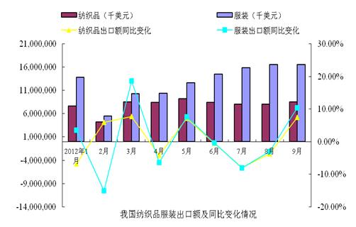 2012年9月,我國紡織品服裝出口額為251.26億美元,環(huán)比增長2.14%,同比增長9.33%。其中,紡織品(包括紡織紗線、織物及制品)出口額為85.41億美元,同比增長7.47%;服裝(包括服裝及衣著附件)出口額為165.84億美元,同比增長10.32%。