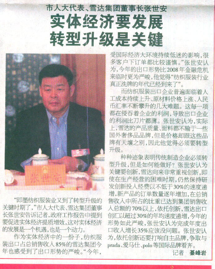 種種跡象表明傳統(tǒng)制造企業(yè)必須轉(zhuǎn)型升級(jí),但是如何能做好?張世安認(rèn)為關(guān)鍵要?jiǎng)?chuàng)新,雪達(dá)向來(lái)非常重視創(chuàng)新,即使在生產(chǎn)經(jīng)營(yíng)的困難時(shí)期,仍然保持研發(fā)創(chuàng)新投入經(jīng)費(fèi)以不低于30%的速度遞增,新產(chǎn)品的訂單數(shù)量逐年增加,在總銷售收入中所占的比重已達(dá)到集團(tuán)銷售收入總額的70%以上,依托創(chuàng)新,雪達(dá)出口創(chuàng)匯以超過(guò)30%的年均速度遞增,今年的形勢(shì)如此嚴(yán)峻,張世安認(rèn)為完成年度出口收入增長(zhǎng)35%應(yīng)該沒(méi)問(wèn)題。張世安認(rèn)為,依托創(chuàng)新還要打響自主品牌,爭(zhēng)取與prada、愛(ài)馬仕、polo等國(guó)際品牌看齊。