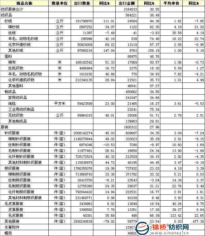 錦橋紡織網(wǎng)—資訊頻道> 統(tǒng)計(jì)資料>正文 2010年1-8月我國對(duì)美國出口紡織品服裝統(tǒng)計(jì)