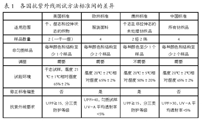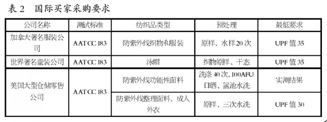 各國(guó)客戶對(duì)防曬產(chǎn)品的要求 歐美買家對(duì)防紫外線紡織產(chǎn)品有著不同的要求,也會(huì)采用不同的標(biāo)準(zhǔn)。他們對(duì)防紫外線紡織品的采購(gòu)要求都是以最終產(chǎn)品用途為依據(jù),而不是根據(jù)織物類型和整理工藝來(lái)定。就美國(guó)客戶而言,一般要求對(duì)產(chǎn)品進(jìn)行相應(yīng)的預(yù)處理,按AATCC183標(biāo)準(zhǔn)測(cè)試后,再以ASTMD6603標(biāo)準(zhǔn)來(lái)評(píng)定產(chǎn)品的防紫外線能力,根據(jù)產(chǎn)品用途確定所需要的產(chǎn)品防紫外線等級(jí)和不同的UPF值(詳見(jiàn)表2)。而歐洲客戶則以EN13758.2標(biāo)準(zhǔn)為評(píng)判產(chǎn)品的防紫外線性能,要求抗紫外線產(chǎn)品的UPF值在40以上,但也有少數(shù)歐洲客戶要求采用BS7914標(biāo)準(zhǔn)來(lái)測(cè)定產(chǎn)品的防紫外線性能?! ?/p>