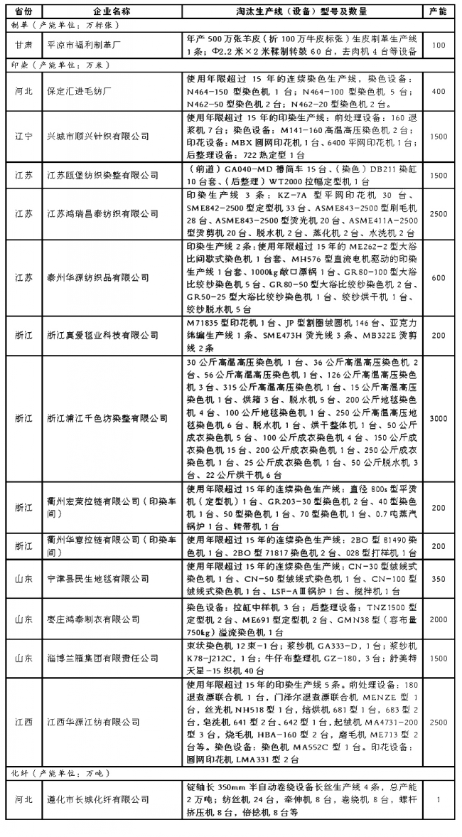 此次公布的淘汰落后產(chǎn)能名單,印染、水泥(熟料及磨機(jī))為淘汰產(chǎn)能大戶,需分別淘汰16450萬米、1008萬噸。其他行業(yè)淘汰產(chǎn)能數(shù)制革100萬標(biāo)張,化纖1萬噸。