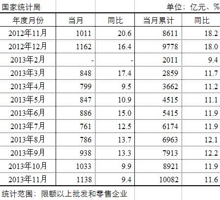 錦橋紡織網(wǎng)—資訊頻道> 紡織動態(tài)>正文 2013年全國服裝鞋帽、針紡織品零售情況