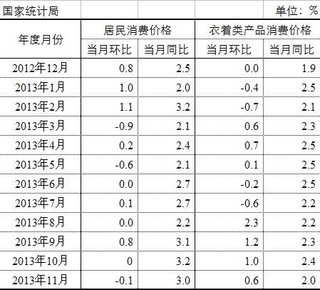 2013年中國居民消費(fèi)價(jià)格及衣著類消費(fèi)價(jià)格