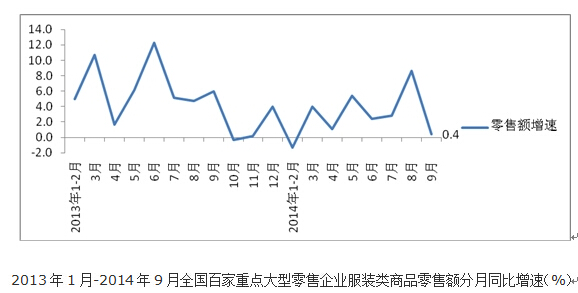 根據(jù)中華全國商業(yè)信息中心的統(tǒng)計,2014年前三季度全國百家重點大型零售企業(yè)服裝類商品零售額同比增長1.7%,增速較上年同期低4.7個百分點,較上半年回升0.5個百分點。其中9月份全國百家重點大型零售企業(yè)服裝類商品零售額同比增長0.4%,增速較上年同期低5.6個百分點,較上月大幅下滑8.2個百分點。