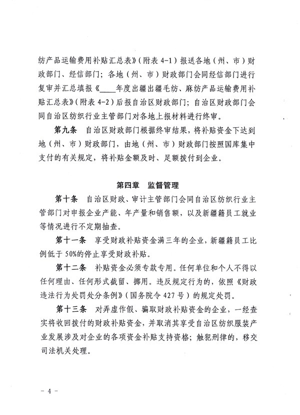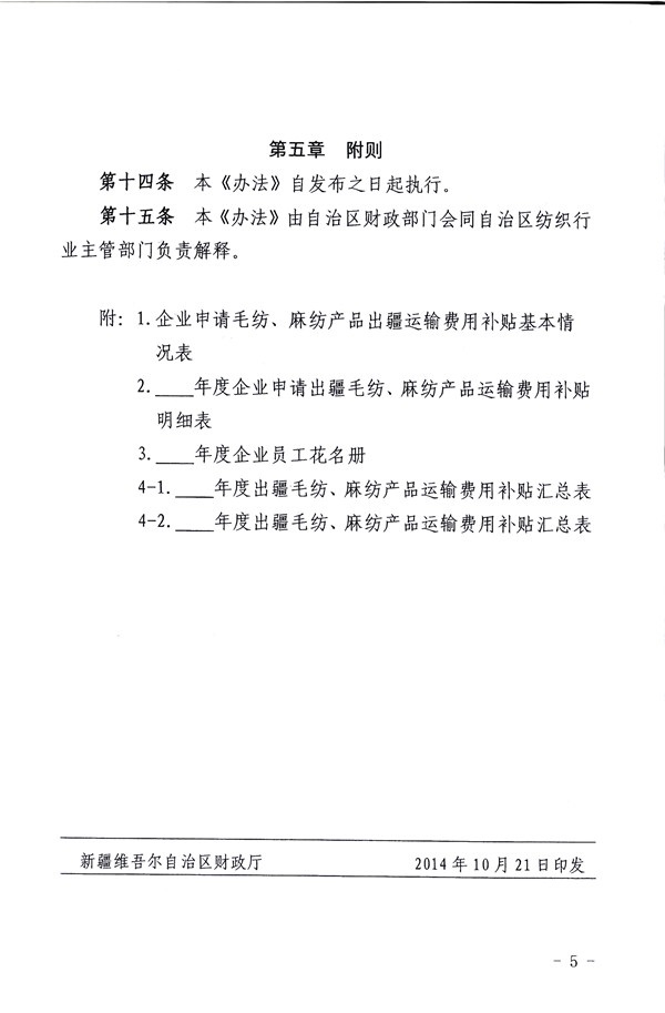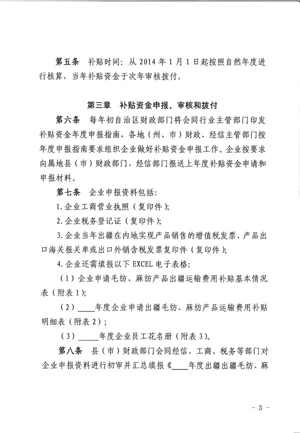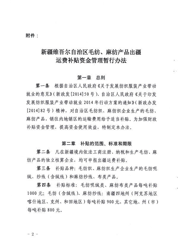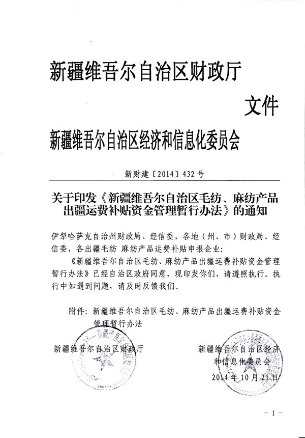 錦橋紡織網(wǎng)—資訊頻道> 紡織動態(tài)>正文 《新疆維吾爾自治區(qū)毛紡 麻紡產(chǎn)品出疆運費補貼資金管理暫行辦法》 ——(新財建[2014]432號)